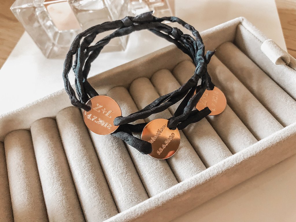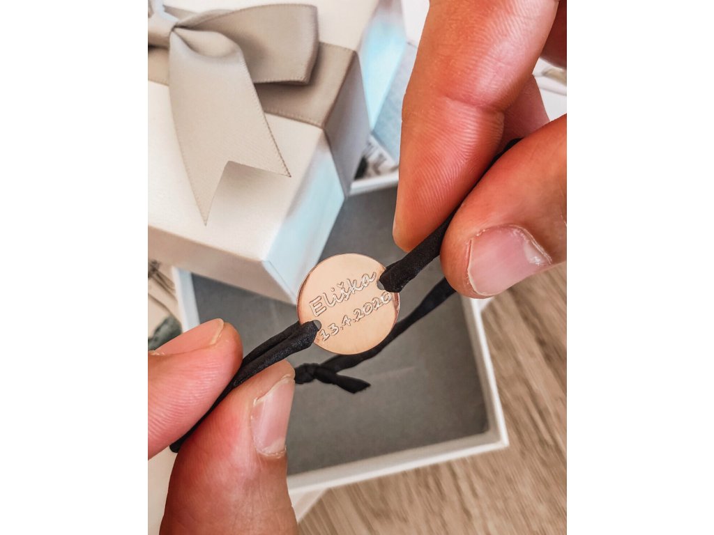Noste svůj příběh s hrdostí díky tomuto jemnému personalizovanému náramku na hedvábné stužce. Kulatý stříbrný přívěsek s možností gravírování vašeho jména, data nebo symbolu promění každý náramek v unikátní personalizovaný šperk. Elegantní, lehký a ručně vyráběný – ideální dárek, který bude připomínkou významných okamžiků po celý život.